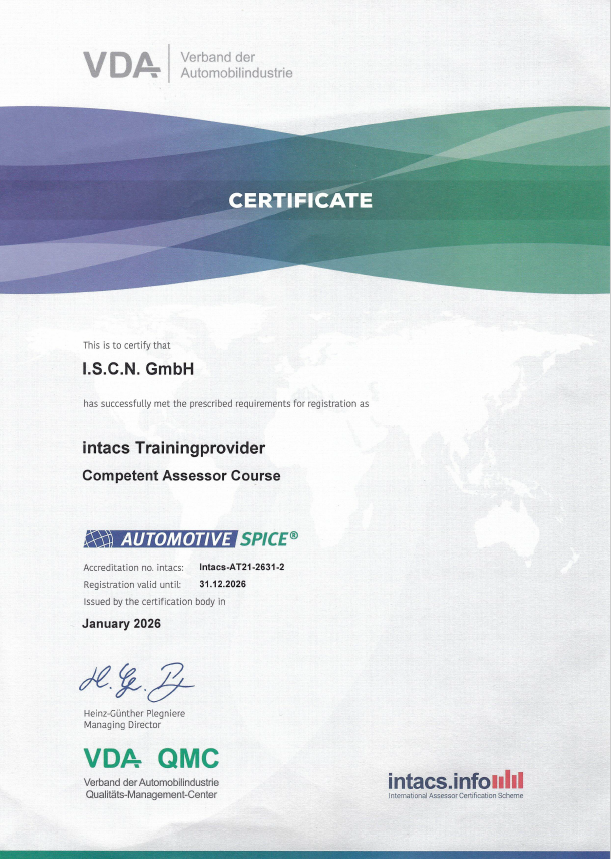 ISCN is also training provider for Automotive SPICE courses certified by the VDA-QMC (German Automotive Association - Quality Management Center) and an
